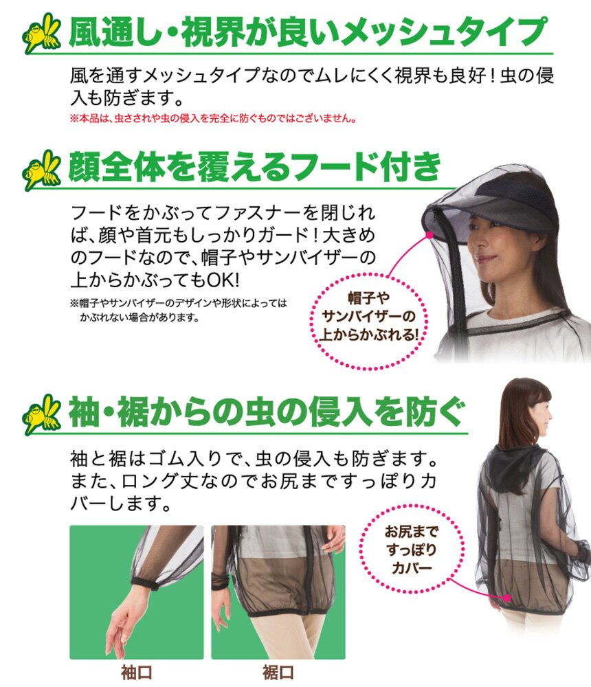 風通し、視界が良いメッシュタイプ顔全体を覆えるフード付き袖裾から虫の侵入を防ぐ■商品名:顔まですっぽり虫よけネットパーカー■適応サイズ:M-L:チェスト79-104cm、身長154-185cm■重量:(約)61g■材質:本体:ナイロン100%・ゴム部:ポリエステル100%■仕様:洗濯可(ネット使用)■生産国:中国■JANコード:4571414679916虫の侵入を防ぎ風通しよくさわやか風通し、視界が良いメッシュタイプ顔全体を覆えるフード付き袖裾から虫の侵入を防ぐ顔まですっぽり虫よけネットパーカー【新聞掲載】適応サイズM-L:チェスト79-104cm、身長154-185cm重量(約)61g材質本体:ナイロン100%・ゴム部:ポリエステル100%仕様洗濯可(ネット使用)生産国中国JANコード4571414679916※お使いの端末によって実際の商品と色が若干異なる場合がございます。